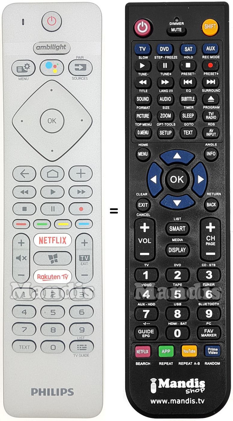 Below, we will show you the correspondence between each button on the original remote control and the button that performs the same function on the replacement remote control. In some cases, you may need to press the SHIFT key before pressing another button to perform certain actions. These additional functions are often not widely used and are included to facilitate understanding of the replacement remote control, or because the original remote control has more buttons than its equivalent.