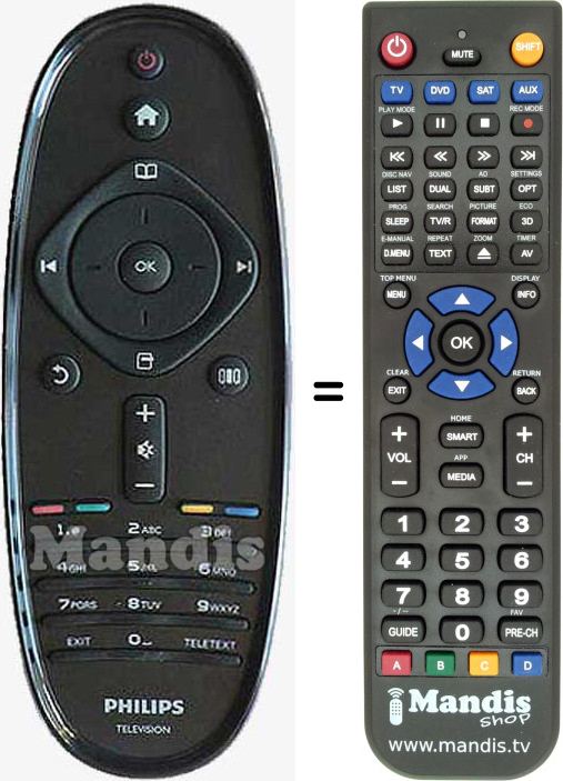 Below, we will show you the correspondence between each button on the original remote control and the button that performs the same function on the replacement remote control. In some cases, you may need to press the SHIFT key before pressing another button to perform certain actions. These additional functions are often not widely used and are included to facilitate understanding of the replacement remote control, or because the original remote control has more buttons than its equivalent.