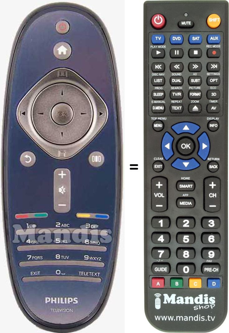 Below, we will show you the correspondence between each button on the original remote control and the button that performs the same function on the replacement remote control. In some cases, you may need to press the SHIFT key before pressing another button to perform certain actions. These additional functions are often not widely used and are included to facilitate understanding of the replacement remote control, or because the original remote control has more buttons than its equivalent.