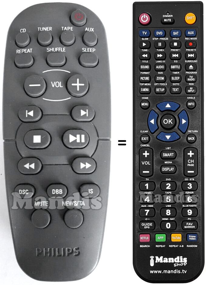 Below, we will show you the correspondence between each button on the original remote control and the button that performs the same function on the replacement remote control. In some cases, you may need to press the SHIFT key before pressing another button to perform certain actions. These additional functions are often not widely used and are included to facilitate understanding of the replacement remote control, or because the original remote control has more buttons than its equivalent.
