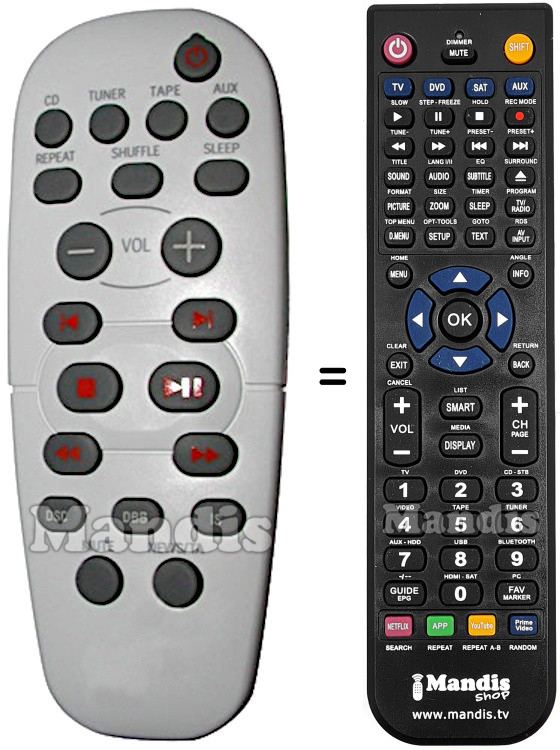 This remote control performs all the functions of the original remote control: Power, CD, TUNER, TAPE, AUX, Repeat, Shuffle, Sleep, Vol-, Vol+, I<, >I, Stop, Play / Pause, <<, >>, DSC, DBB, IS, Mute, News / TA