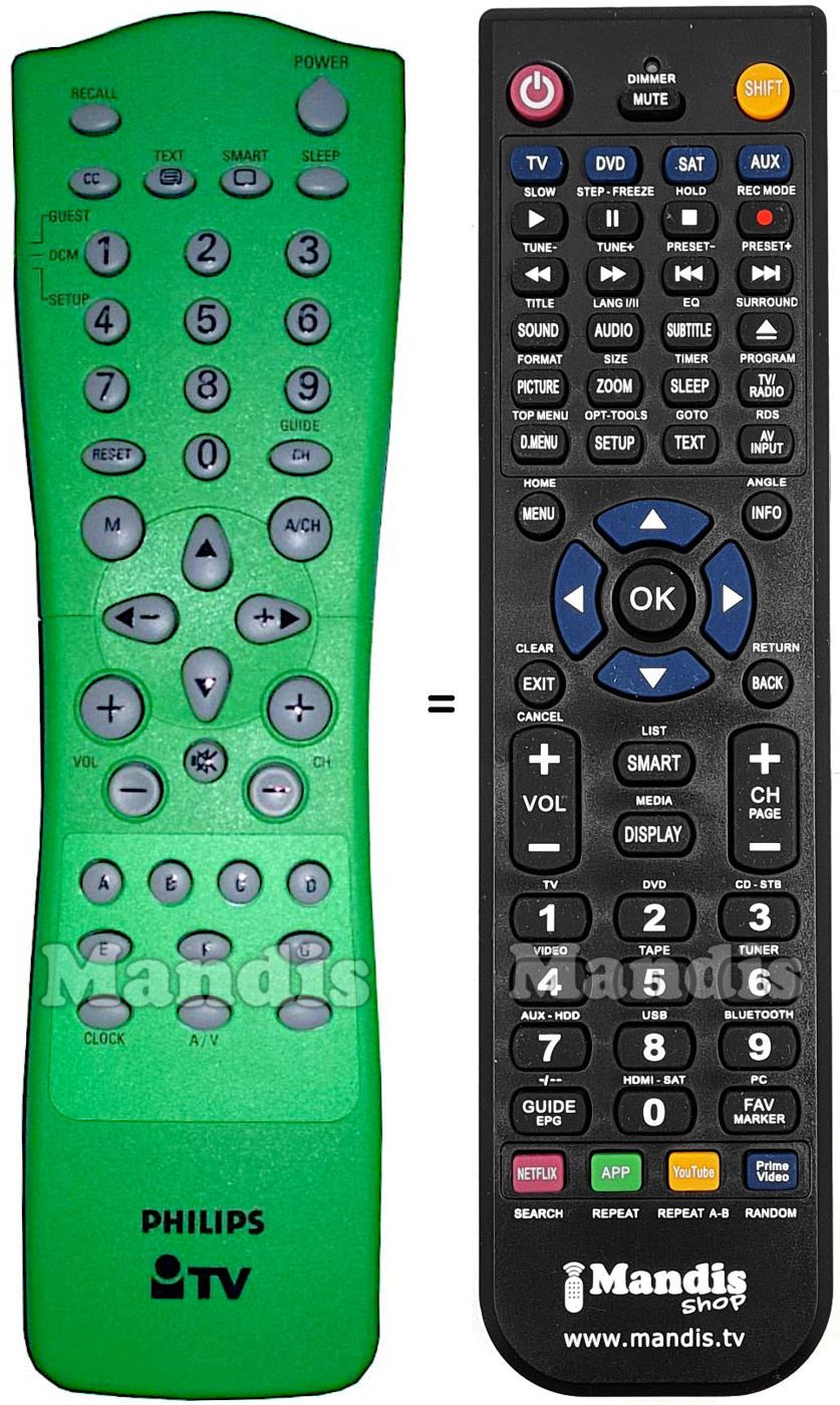 This remote control performs all the functions of the original remote control: Power, Recall, CC, Text, Smart, Sleep, 1, 2, 3, 4, 5, 6, 7, 8, 9, 0, Reset, CH / Guide, M, A / CH, Up, Left / -, Right / +, Down, Vol+, Vol-, Mute, CH+, CH-, A, B, C, D, E, F, G, Clock, A / V,