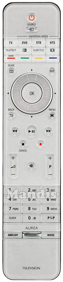 Power, Source, TV, Universal Mode DVD, Universal Mode STB, Universal Mode HTS, Teletext, [1|2], Subtitle, [|<>|], Red / Demo, Green, Yellow, Blue, Guide, Info, Up, Left, OK, Right, Down, Back, Menu, <<, Play / Pause, >>, Stop / Cancel, Rec, Vol+, Vol-, Mute, P+, P-, 1, 2, 3, 4, 5, 6, 7, 8, 9, 0, Clock, P⇄P, Ambilight, Aurea Up, Aurea Down, Mode