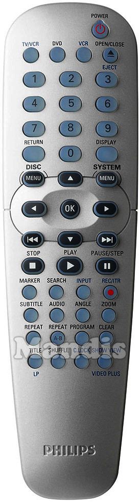 Power, TV/VCR, DVD, VCR, Open/Close / Eject, 1, 2, 3, 4, 5, 6, 7, 8, 9, 0, Return, Display, Disc Menu, System Menu, Up, Left, OK, Right, Down, I<<, >>I, Stop, Play, Pause / Step, Marker, Search, Input, Rec / ITR, Subtitle, Audio, Angle, Zoom, Repeat, Repeat A-B, Program, Clear, Title / LP, Shuffle, C.Lock, Show View / Video Plus