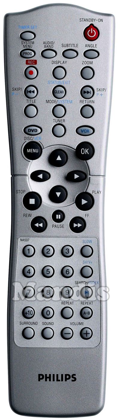 Standby-On, Timer Set, Prog / System Menu, Audio / Band, Subtitle, Angle, Rec, Display, Zoom, I<< Skip / P -, Clear / Status / Exit, >>I Skip / P +, Title, Mode / System, Return, DVD, Tuner, VCR, Disc/VCR Menu, OK, Up, Left, Right, Down, Stop, Play, Pause, << REW, >> FF, 1, 2, 3, 4, 5, 6, 7, 8, 9, 0, +10, Repeat, Slow, SV / V+, >I / Search / Index, Repeat A-B, Surround, Sound, Volume -, Volume +