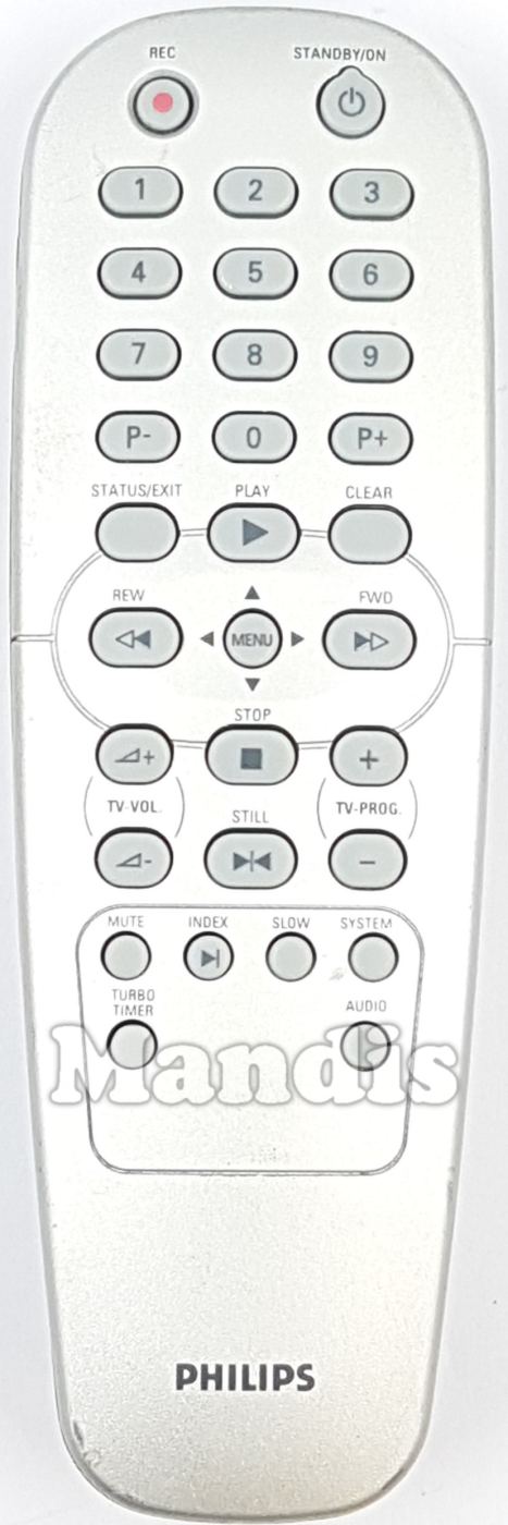 REC, Standby / On, 1, 2, 3, 4, 5, 6, 7, 8, 9, 0, P-, P+, Status / Exit, Clear, Play / Up, ◀◀ REW / Left, Menu, ▶▶ FWD / Right, Stop / Down, TV Vol +, TV Vol -, ▶|◀ Still, TV Prog +, TV Prog -, Mute, ▶| / Index, Slow, System, Turbo Timer, Audio