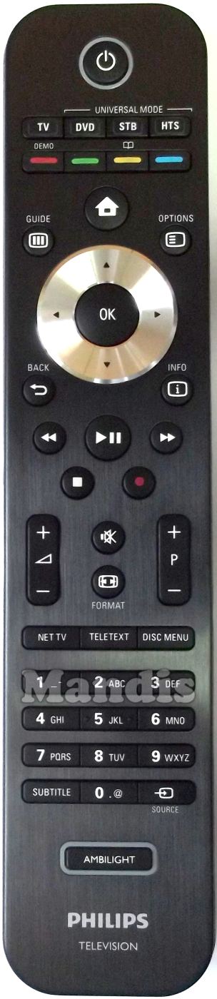 power, tv, dvd, stb, hts, red/demo, green, yellow/ [ I ], blue, guide, options, home, back, [i]/Info, ok, up, down, right, left, <<, >>, play/pause, stop, rec, vol+, vol-, pr+, pr-, mute, [<>]/Format, net tv, teletext, disc menu, 1, 2, 3, 4, 5, 6, 7, 8, 9, 0, subtitle , source, Ambilight