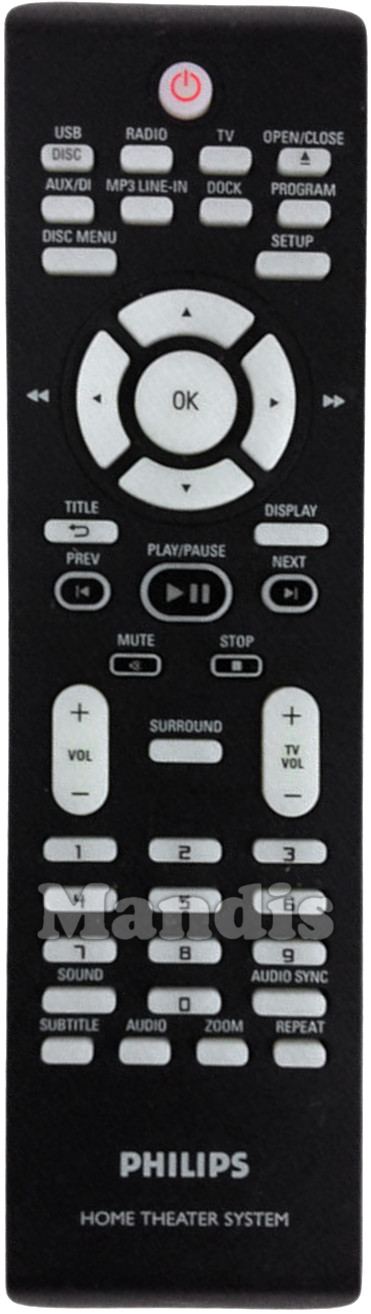 Power, Disc / USB, Radio, TV, Open / Close, Aux / DI, MP3 Line-In, Dock, Program, Disc Menu, Setup, Up, Left / <<, OK, Right / >>, Down, Back / Title, Display, I< Prev, Play / Pause, >I Next, Mute, Stop, Surround, Vol +, Vol -, TV Vol +, TV Vol -, 1, 2, 3, 4, 5, 6, 7, 8, 9, 0, Sound, Audio Sync, Subtitle, Audio, Zoom, Repeat
