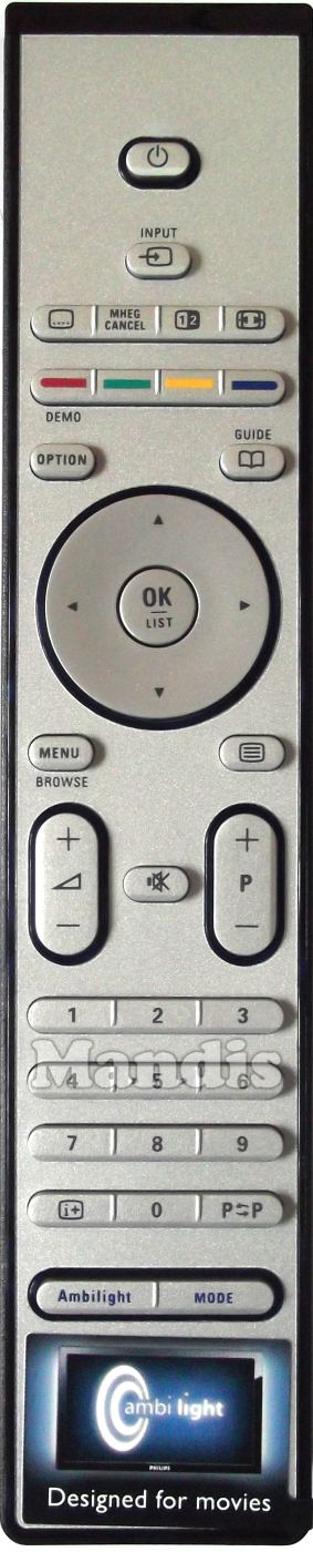 POWER, INPUT, [...], MHEG/Cancel, [1I2], [<>], RED/DEMO, GREEN, YELLOW, BLUE, OPTION, GUIDE, MENU/BROWSE, [=], OK/LIST, UP, DOWN, RIGHT, LEFT, VOL+, VOL-, P+, P-, MUTE, 1, 2, 3, 4, 5, 6, 7, 8, 9, 0, [i+], P↔P, AMBILIGHT, MODE
