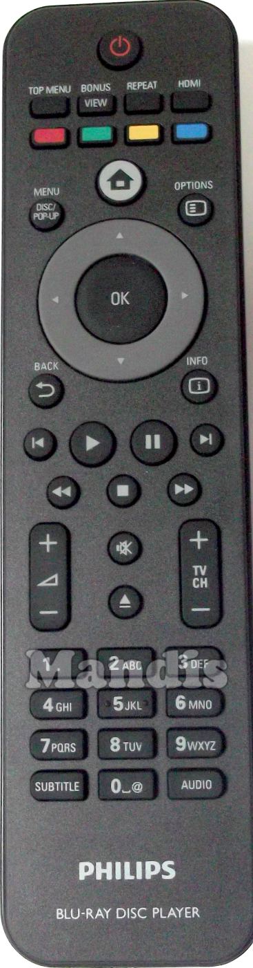 Power, Top Menu, View/Bonus, Repeat, HDMI, Red, Green, Yellow, Blue, Disc/Pop-Up/Menu, Options, Home, Up, Down, Right, Left, OK, Back, Info, I<, Play, Pause, >I, Stop, <<, >>, Mute, Open/Close, Vol+, Vol-, Tv CH+, Tv CH-, 1, 2, 3, 4, 5, 6, 7, 8, 9, 0, Subtitle, Audio