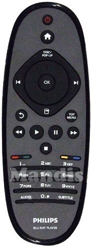 Power, Home, Disc / Pop Up, Options, >I, I<, Up, Down, Right, Left, OK, Return, Top Menu, <<, Play, Pause, >>, Stop, Red, Green, Yellow, Blue, 1, 2, 3, 4, 5, 6, 7, 8, 9, 0, Audio, Subtitle
