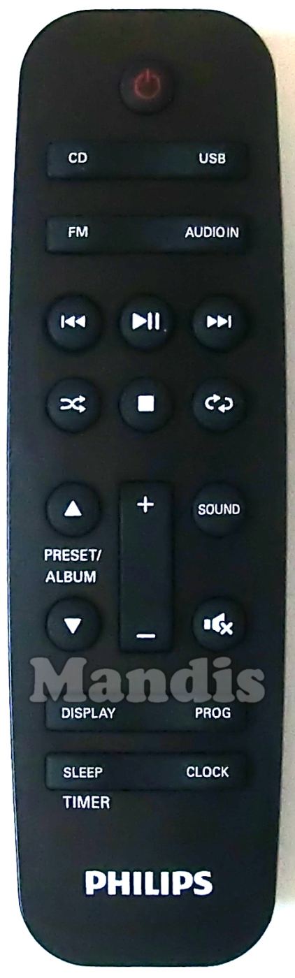 Power, CD, USB, FM, Audio In, I<<, Play / Pause, >>I, Random, Stop, Repeat, Preset + / Album +, Preset - / Album -, Vol +, Vol -, Sound, Mute, Display, Prog, Sleep / Timer, Clock