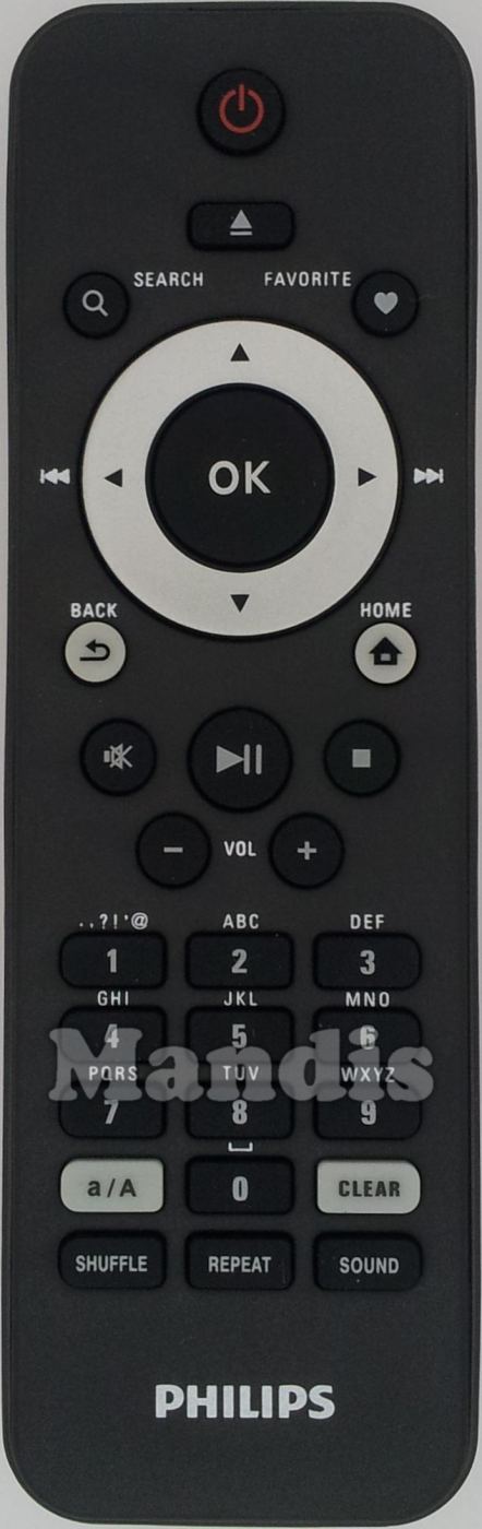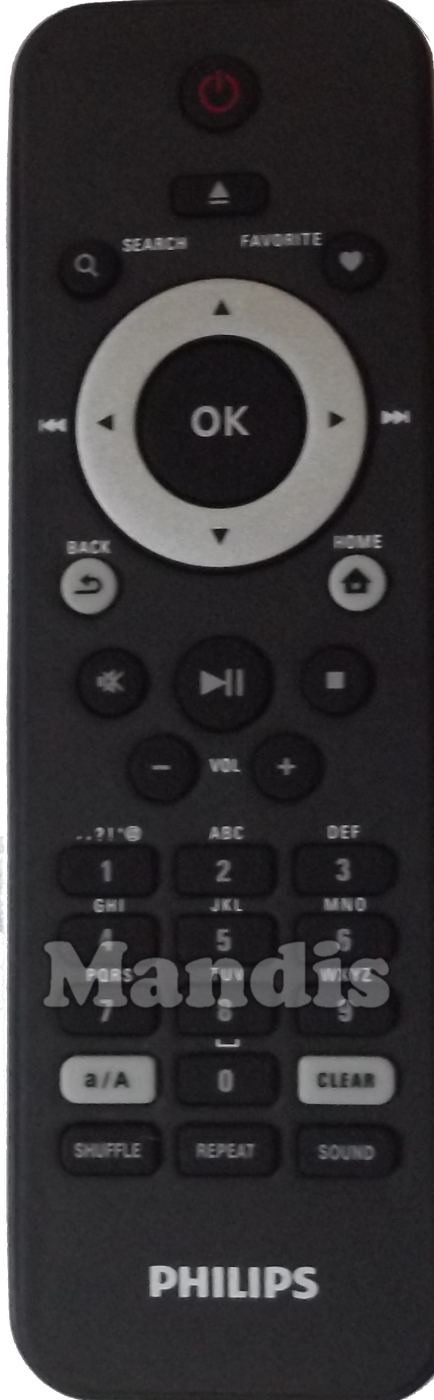 Power, Eject, Search, ♥/Favorite, OK, Up, Down, Right, Left, Back, Home, Mute, Stop, Play/Pause, Vol-, Vol+, 1, 2, 3, 4, 5, 6, 7, 8, 9, 0, a/A, Clear, Shuflle, Repeat, Sound
