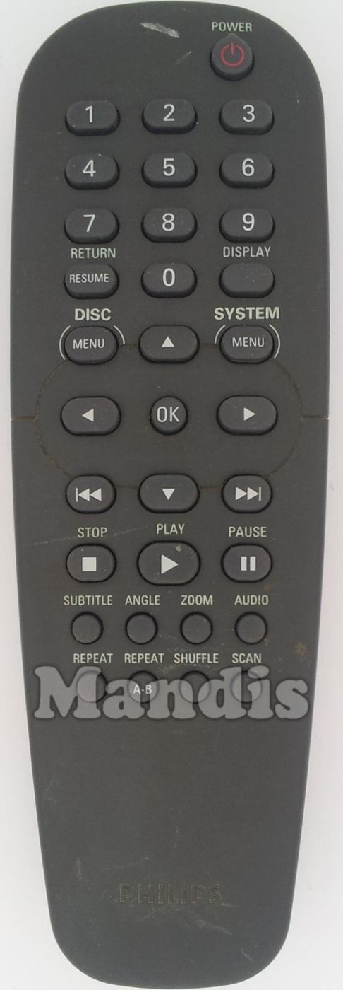 Power, 1, 2, 3, 4, 5, 6, 7, 8, 9, Resume/Return, Display, 0, Menu Disc, Menu System, Up, Down, Right, Left, OK, >>I, I<<, Stop, Pause, Play, Subtitle, Angle, Zoom, Audio, Scan, Repeat, A-B Repeat, Shuffle