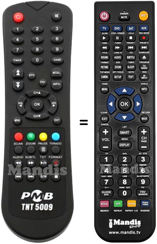 This remote control replaces most of the functions of your TNT5009. It is not a universal remote control, but a copy with most of the buttons and functions of your original.