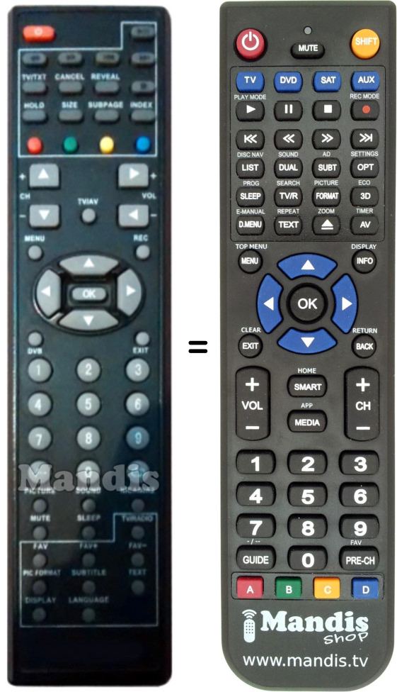 Below, we will show you the correspondence between each button on the original remote control and the button that performs the same function on the replacement remote control. In some cases, you may need to press the SHIFT key before pressing another button to perform certain actions. These additional functions are often not widely used and are included to facilitate understanding of the replacement remote control, or because the original remote control has more buttons than its equivalent.