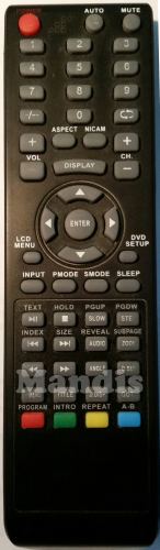 Power, Auto, Mute, 1, 2, 3, 4, 5, 6, 7, 8, 9, 0, -/--, Recall, Vol+, Vol-, Aspect, Nicam, CH+, CH-, Display, Up, Down, Left, Right, LCD Menu, DVD Setup, Input, P.Mode, S.Mode, Sleep, Play/Pause/Text, Stop/Hold, Slow/PGUP, STE/PGDW, I<</Index, >>I/Size, Audio/Reveal, Zoom/Subpage, <<, >>, Angle, D.Subt, Menu, Title, D.Disp, GOT, Red/Program, Green/Intro, Yellow/Repeat, Blue/A-B, Enter