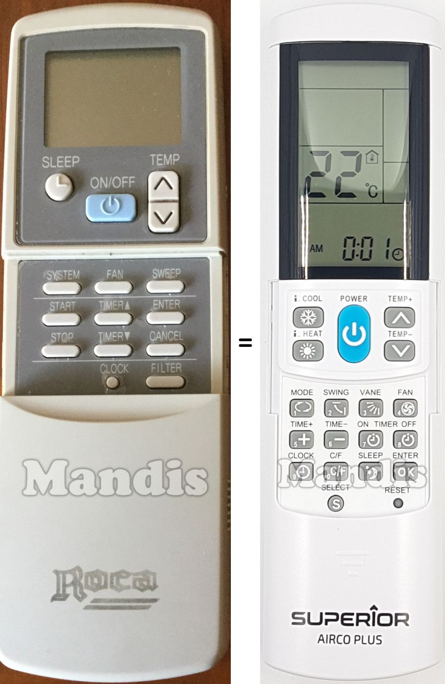 My LG air-conditioner's remote died and need replacement. AircoPlus did the job. I should point out that the code match did not correspond according to manufacturer's table. Let the auto-search code set up do the work. Also, excellent service by Mandis Remotes with a well-protected package.
