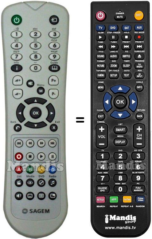Below, we will show you the correspondence between each button on the original remote control and the button that performs the same function on the replacement remote control. In some cases, you may need to press the SHIFT key before pressing another button to perform certain actions. These additional functions are often not widely used and are included to facilitate understanding of the replacement remote control, or because the original remote control has more buttons than its equivalent.