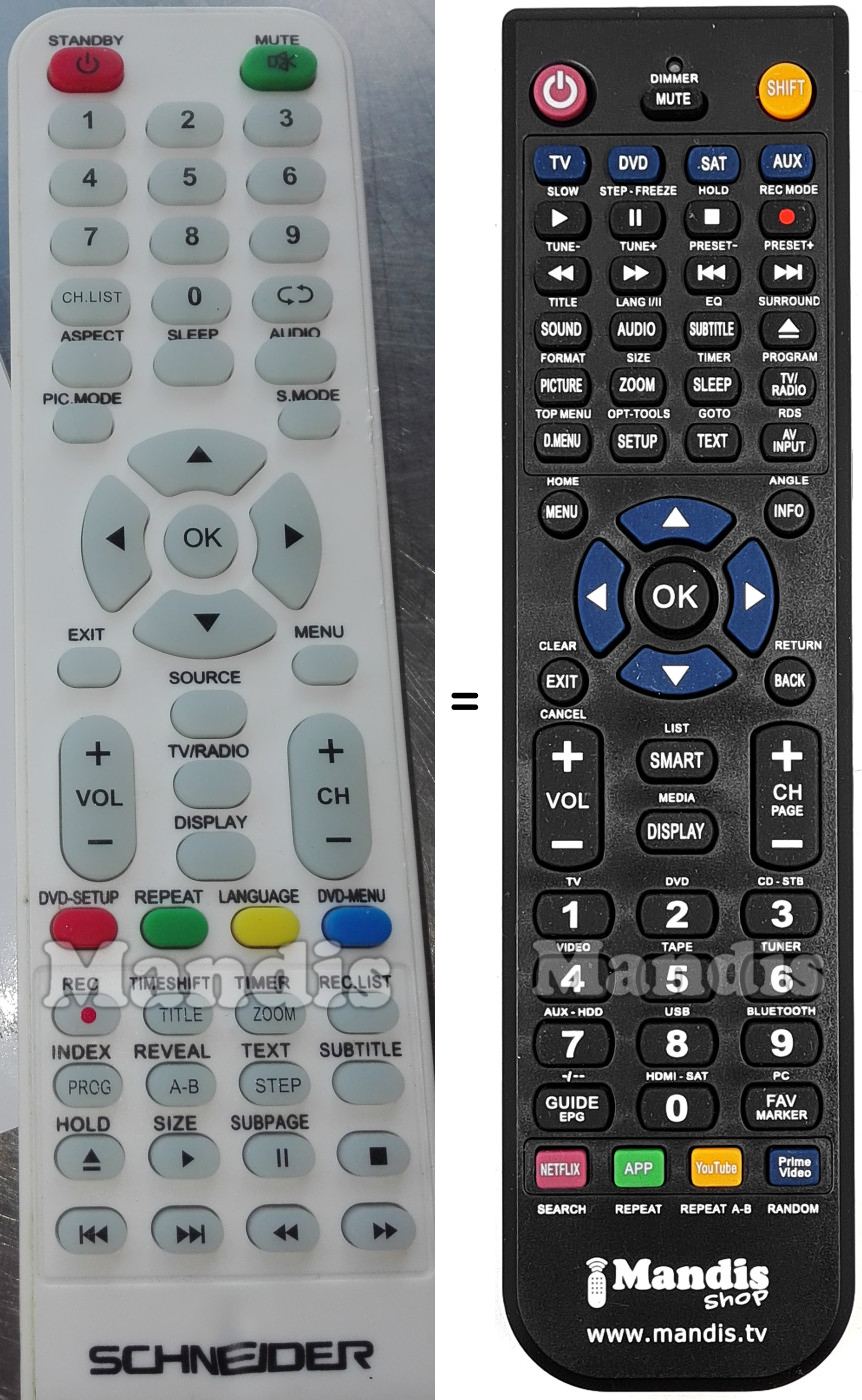 Below, we will show you the correspondence between each button on the original remote control and the button that performs the same function on the replacement remote control. In some cases, you may need to press the SHIFT key before pressing another button to perform certain actions. These additional functions are often not widely used and are included to facilitate understanding of the replacement remote control, or because the original remote control has more buttons than its equivalent.