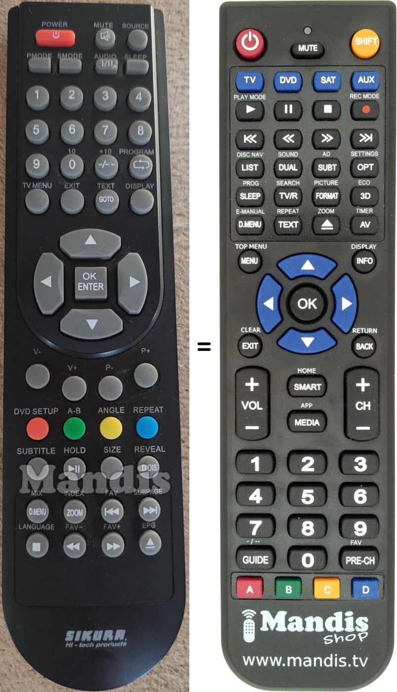 Below, we will show you the correspondence between each button on the original remote control and the button that performs the same function on the replacement remote control. In some cases, you may need to press the SHIFT key before pressing another button to perform certain actions. These additional functions are often not widely used and are included to facilitate understanding of the replacement remote control, or because the original remote control has more buttons than its equivalent.