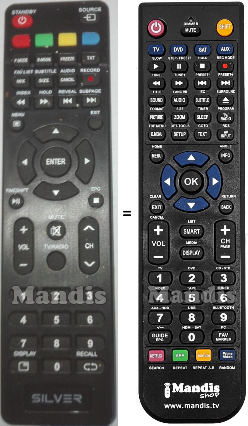 Below, we will show you the correspondence between each button on the original remote control and the button that performs the same function on the replacement remote control. In some cases, you may need to press the SHIFT key before pressing another button to perform certain actions. These additional functions are often not widely used and are included to facilitate understanding of the replacement remote control, or because the original remote control has more buttons than its equivalent.
