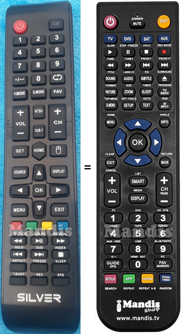 Below, we will show you the correspondence between each button on the original remote control and the button that performs the same function on the replacement remote control. In some cases, you may need to press the SHIFT key before pressing another button to perform certain actions. These additional functions are often not widely used and are included to facilitate understanding of the replacement remote control, or because the original remote control has more buttons than its equivalent.
