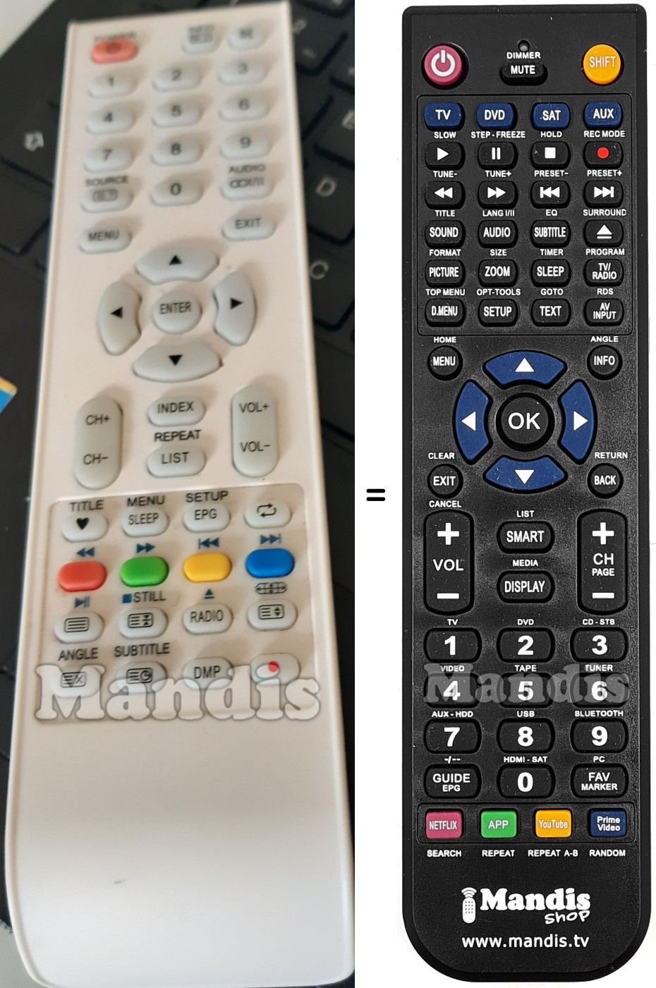 Below, we will show you the correspondence between each button on the original remote control and the button that performs the same function on the replacement remote control. In some cases, you may need to press the SHIFT key before pressing another button to perform certain actions. These additional functions are often not widely used and are included to facilitate understanding of the replacement remote control, or because the original remote control has more buttons than its equivalent.