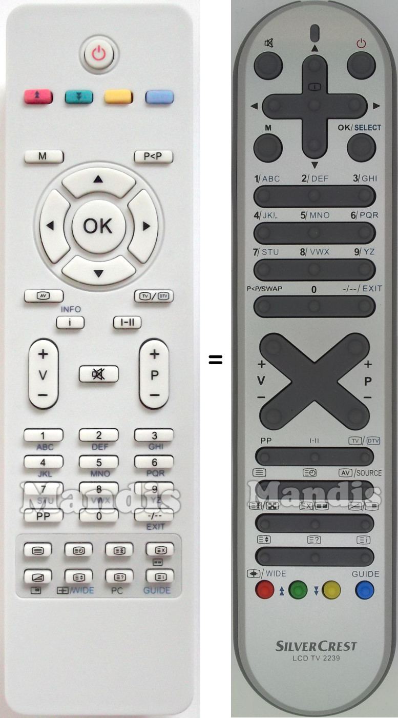 This remote control has the following buttons: Mute, Power, M, OK/Select, Up, Down, Right, Left, [i], 1, 2, 3, 4, 5, 6, 7, 8, 9, 0, P<P/Swap, -/--/ Exit, Vol+, Vol-, P+, P-, PP, I-II, Tv/DTV, [=], [=O], AV/Source, [=+]/[X], [=X]/[▪▪], [.=]/[ ▪], [=♦], [=?], [=i], Red/[+]/Wide/↑, Green/↓, Yellow, Blue/Guide