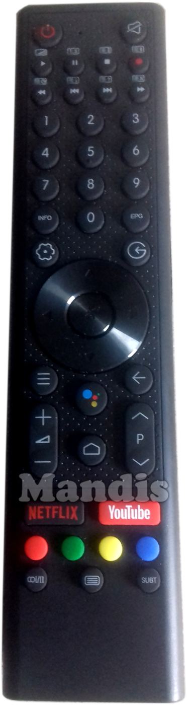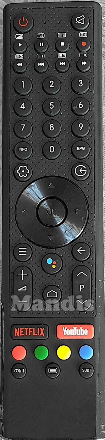 Power, Mute, Play / [ /≡], Pause / [T.S], Stop / [≡⧗], Rec / [≡↕], << / [≡◷], I<< / [≡i], >>I / [≡?], >> / [≡X], 1, 2, 3, 4, 5, 6, 7, 8, 9, 0, Info, EPG, Input, Settings ⚙, Up, Left, OK, Right, Down, ☰, ⬅, Google Assistant, Vol+, Vol-, Home ⌂, P+, P-, Netflix, YouTube, Red, Green, Yellow, Blue, I / II, [≡], Subt