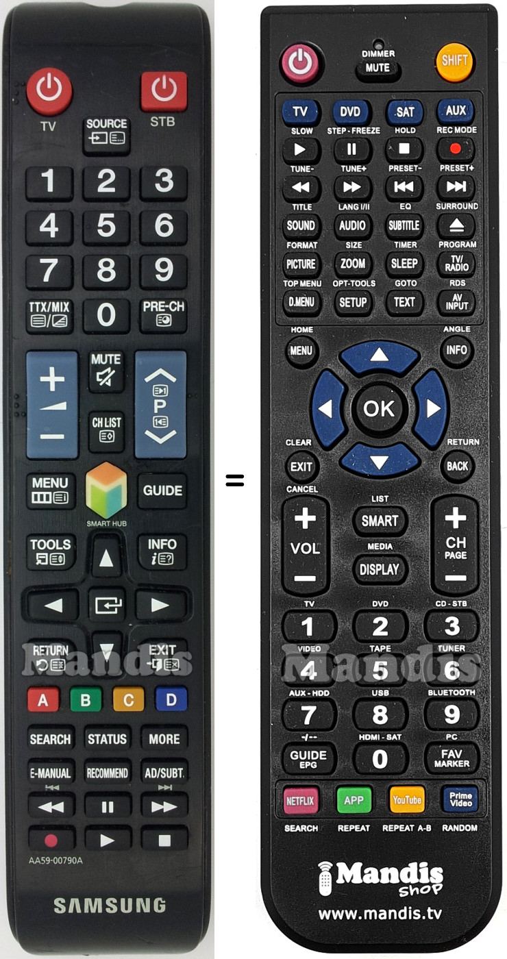 This remote control performs all the functions of the original remote control: Power TV, Power STB, Source, 1, 2, 3, 4, 5, 6, 7, 8, 9, 0, TTX / MIX, Pre-Ch, Vol +, Vol -, Mute, CH List, P +, P -, Menu, Smart Hub, Guide, Tools, Info, Up, Down, Right, Left, , Return, Exit, Red / A, Green / B, Yellow / C, Blue / D, Search, Status, More, E-Manual, Recommended, AD / Subt., << / I<<, Pause, >> / >>I, Rec, Play, Stop