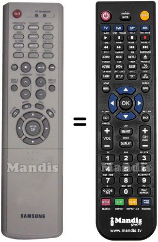 This remote control performs all the functions of the original remote control: Power, Open / Close, Dimmer / TV/Video, Mode, DVD, Tuner / Band, Aux, NTSC/PAL / EZ View, Mo/St / Slow, Sub Title, Step, DSP / EQ, Repeat, I<<, Stop, Play / Pause, >>I, PL II Mode, Volume +, Volume -, Tuning + / CH +, Tuning - / CH -, PL II Effect, Return, Menu, Info, Mute, Up, Right, Down, Left, Enter, 1 / RDS Display, 2, 3 / TA, 4 / PTY -, 5 / PTY Search, 6 / PTY +, 7, 8, 9, 0, Sleep, Cancel, Test Tone, Sound Edit, P.Scan / Tuner Mem., Zoom, Logo, Slide Mode, Digest, Remain