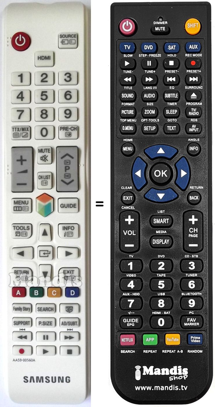 Remote control to replace the original AA59-00560A and all its functions. It is not a universal remote but a substitute for the original. You will receive the remote ready to use: you only need to install the batteries. It is not necessary to program it. We offer you our full guarantee that the remote will fulfil all the functions of the original.