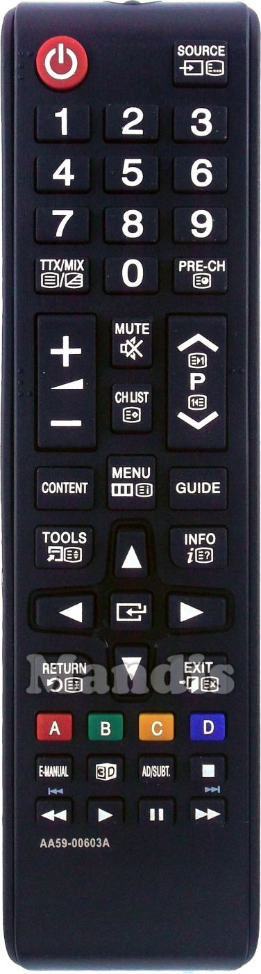 Power, Source, 1, 2, 3, 4, 5, 6, 7, 8, 9, 0, TTX / MIX, Pre-Ch, Vol +, Vol -, Mute, Ch List, P +, P -, Content, Menu, Guide, Tools, Info, Up, Right, Down, Left, Enter, Return, Exit, Red / A, Green / B, Yellow / C, Blue / D, E-Manual, 3D, AD / Subt., Stop, << / I<<, Play, Pause, >> / >>I