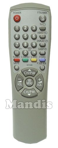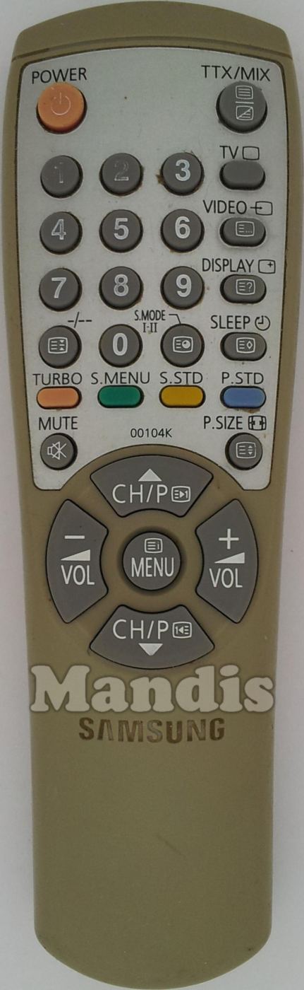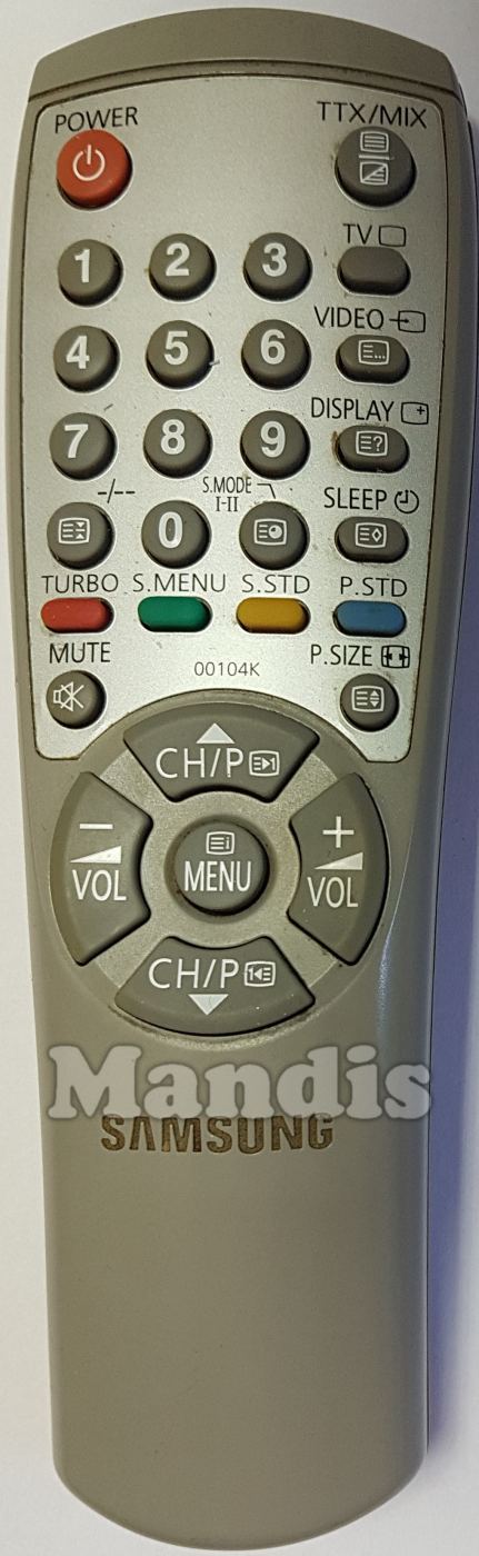 Power, TTX/MIX, 1, 2, 3, 4, 5, 6, Tv, Video, Display, Sleep, 7, 8, 9, 0, [=:]/-/--, [=o]/S.Mode/I-II, Red/Turbo, Green/S.Mume, Yellow/S.STD, Blue/P.STD, Mute, [=♦]/P.Size [<>], Up/CH/P+, Down/CH/P-, Right/Vol+, Left/Vol-, Menu