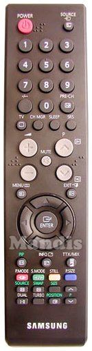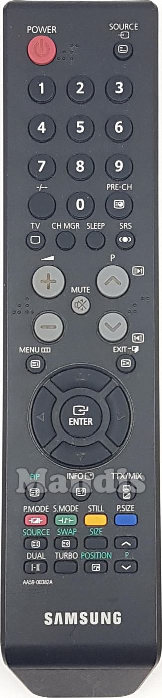 Power, Source, 1, 2, 3, 4, 5, 6, 7, 8, 9, 0, -/--, PRE-CH, TV, CH MGR, Sleep, SRS, Vol+, P+, Vol-, P-, Mute, Menu, Exit, [=+]/PIP, Enter, Left, Right, Up, Down, [=?]/Info, TTX/MIX, Red/P.Mode, Green/S.Mode, Yellow/Still, Blue/P.Size, [=♦]/Source, [=♦]/Swap, Size, I/II/Dual, Turbo, [ +]/Position, P Up, P Down