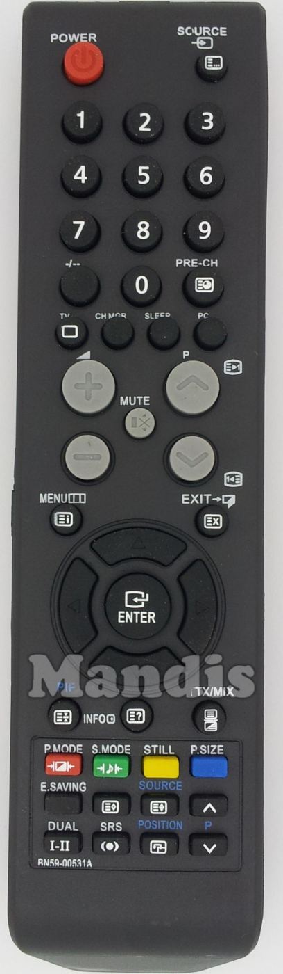 Power, Source, 1, 2, 3, 4, 5, 6, 7, 8, 9, -/--, 0, [=o]/PRE-CH, [ ]/TV, CH MGR, Sleep, PC, Vol+, P+, Vol-, P-, Mute, Menu, Exit, Up, Down, Right, Left, Enter, [=+]/PIP, [=?]/Info, TTX/MIX, Red/P.Mode, Green/S.Mode, Yellow/Still, Blue/P.Size, E.Saving, [=♦], [=♦]/Source, I-II/Dual, (·)/SRS, [^]/Position, P Up, P Down