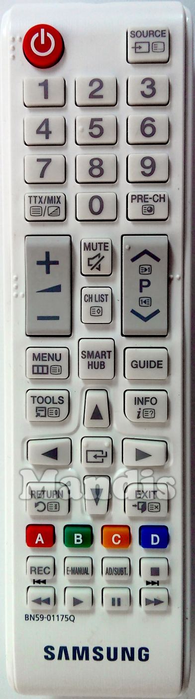 Power, Source, 1, 2, 3, 4, 5, 6, 7, 8, 9, 0, TTX / MIX, PRE-CH, Vol +, Vol -, Mute, CH List, P +, P -, Menu, SMART HUB, Guide, Tools, Info, Up, Left, Enter, Right, Down, Return, Exit, Red, Green, Yellow, Blue, REC, E-Manaual, AD / SUBT., Stop, << / I<<, Play, Pause, >> / >>I