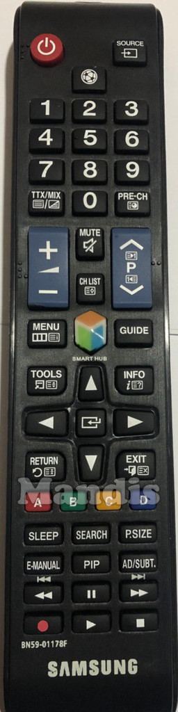 Power, Ball, Source, 1, 2, 3, 4, 5, 6, 7, 8, 9, 0, TTX/MIX, PRE-CH, Mute, CH.List, Smart Hub, Vol+, Vol-, P+, P-, Guide, Menu, Tools, Info, Exit, Return, Up, Down, Right, Left, Enter, Red, Green, Yellow, Blue, Sleep, Search, P.Size, E-Manual, PIP, AD/Subt., <</I<<, >>/>>I, Pause, Play, Stop, Rec