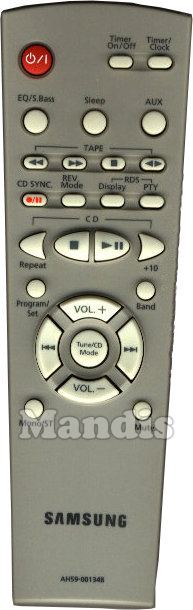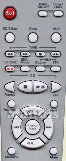 Power, Timer On / Off, Timer / Clock, EQ/S Bass, Sleep, AUX, << Tape, >> Tape, Stop Tape, < > Tape, Rec / Pause / CD Sync, REV. Mode, Display RDS, PTY RDS, Repeat CD, Stop CD, Play / Pause CD, +10 CD, Program / Set, Band, Vol +, Vol -, >>I, I<<, Tune / CD Mode, Mono / Stereo, Mute