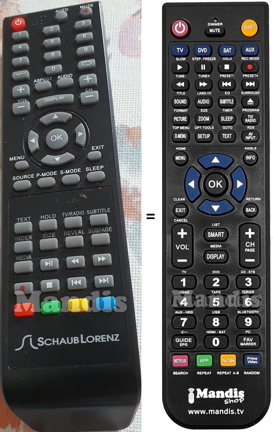 Below, we will show you the correspondence between each button on the original remote control and the button that performs the same function on the replacement remote control. In some cases, you may need to press the SHIFT key before pressing another button to perform certain actions. These additional functions are often not widely used and are included to facilitate understanding of the replacement remote control, or because the original remote control has more buttons than its equivalent.
