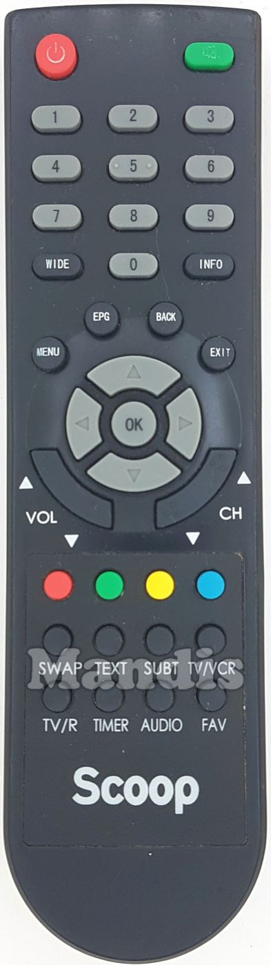 Power, Mute, 1, 2, 3, 4, 5, 6, 7, 8, 9, 0, Wide, Info, EPG, Back, Exit, Menu, Vol+, CH+, Up, Down, Right, Left, Vol-, CH-, OK, Red, Green, Yellow, Blue, Swap, Tv/VCR, Text, Subt, Tv/R, Timer, Audio, FAV