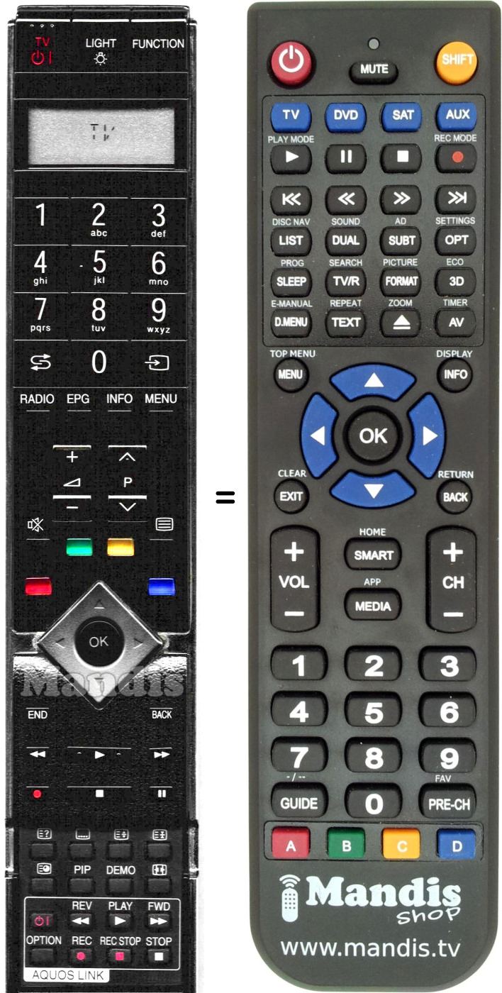 This remote control performs all the functions of the original remote control: TV Power, Light, Function, 1, 2, 3, 4, 5, 6, 7, 8, 9, 0, Recall, Input, Radio, EPG, Info, Menu, Vol+, Vol-, P+, P-, Mute, Text, Red, Green, Yellow, Blue, Up, Left, OK, Right, Down, End, Back, <<, Play, >>, Rec, Stop, Pause, [≡?], [....], [≡↕], [≡⧗], [≡◕], PIP, Demo, Format, Aquos Link Power, Aquos Link << REV, Aquos Link Play, Aquos Link >> FWD, Aquos Link Option, Aquos Link Rec, Aquos Link Rec Stop, Aquos Link Stop