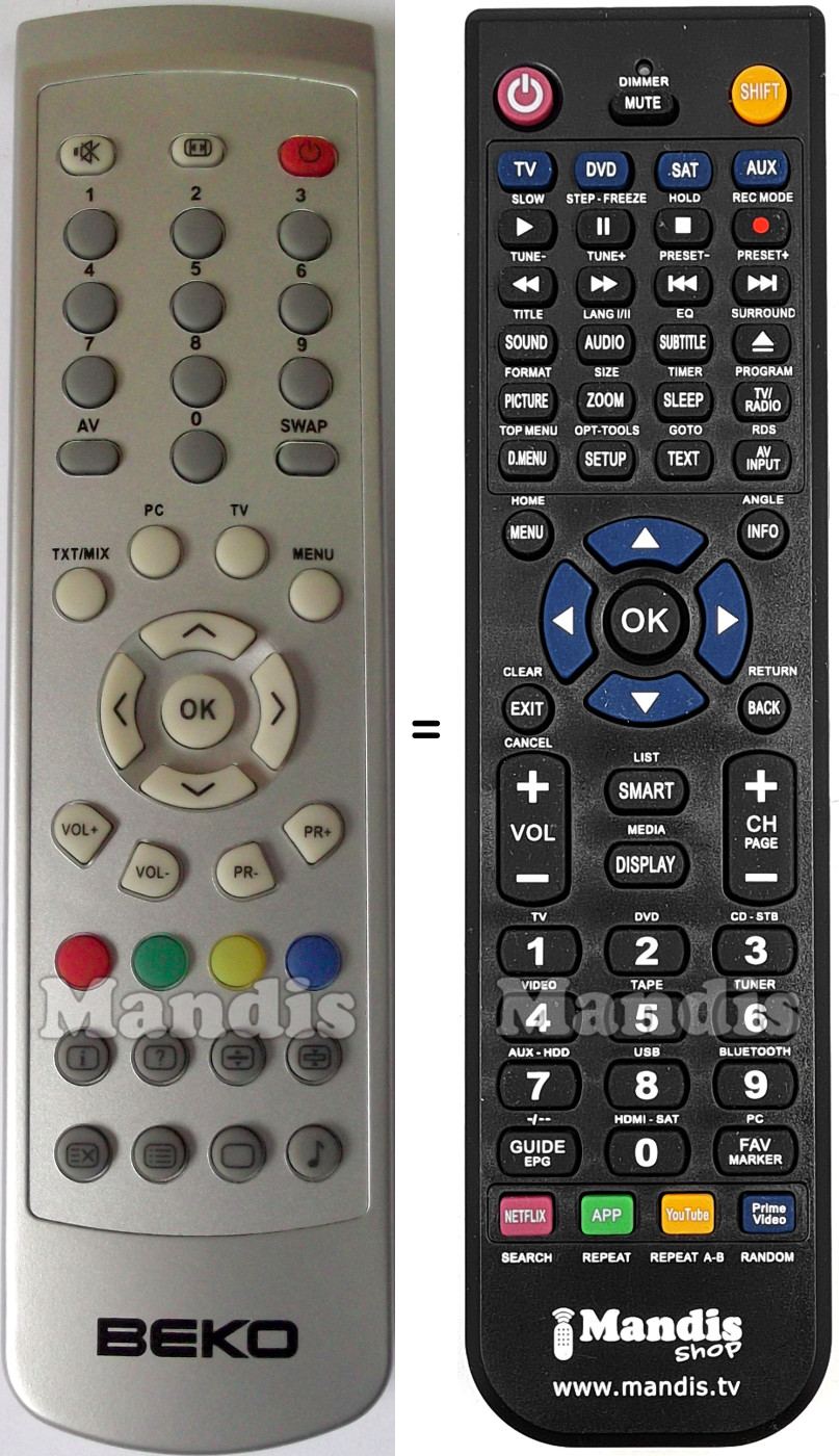 Below, we will show you the correspondence between each button on the original remote control and the button that performs the same function on the replacement remote control. In some cases, you may need to press the SHIFT key before pressing another button to perform certain actions. These additional functions are often not widely used and are included to facilitate understanding of the replacement remote control, or because the original remote control has more buttons than its equivalent.