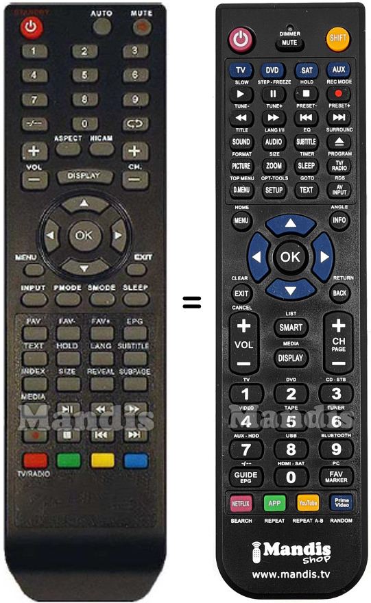 Below, we will show you the correspondence between each button on the original remote control and the button that performs the same function on the replacement remote control. In some cases, you may need to press the SHIFT key before pressing another button to perform certain actions. These additional functions are often not widely used and are included to facilitate understanding of the replacement remote control, or because the original remote control has more buttons than its equivalent.