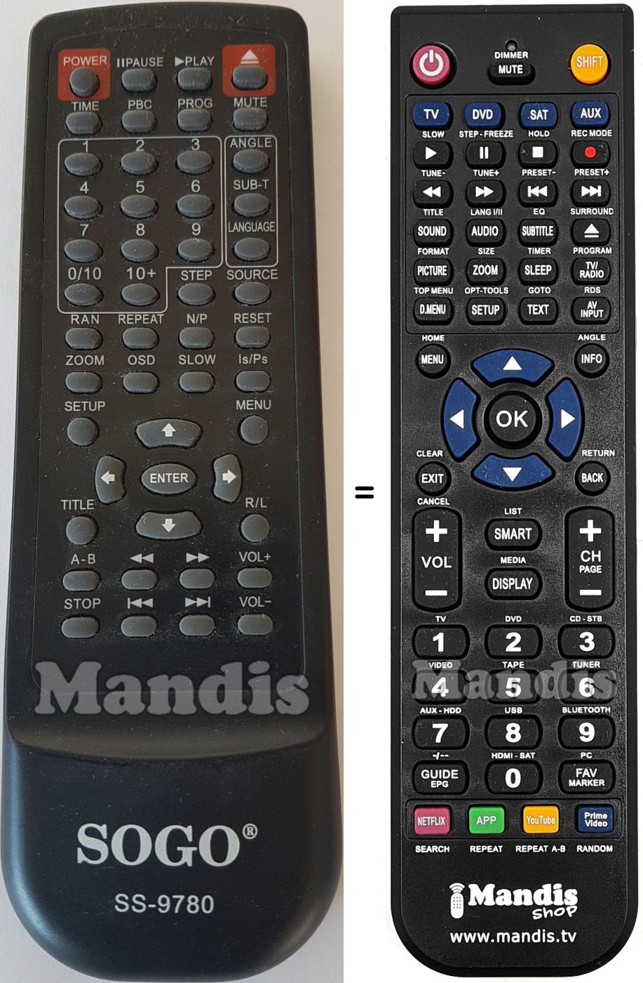 Below, we will show you the correspondence between each button on the original remote control and the button that performs the same function on the replacement remote control. In some cases, you may need to press the SHIFT key before pressing another button to perform certain actions. These additional functions are often not widely used and are included to facilitate understanding of the replacement remote control, or because the original remote control has more buttons than its equivalent.