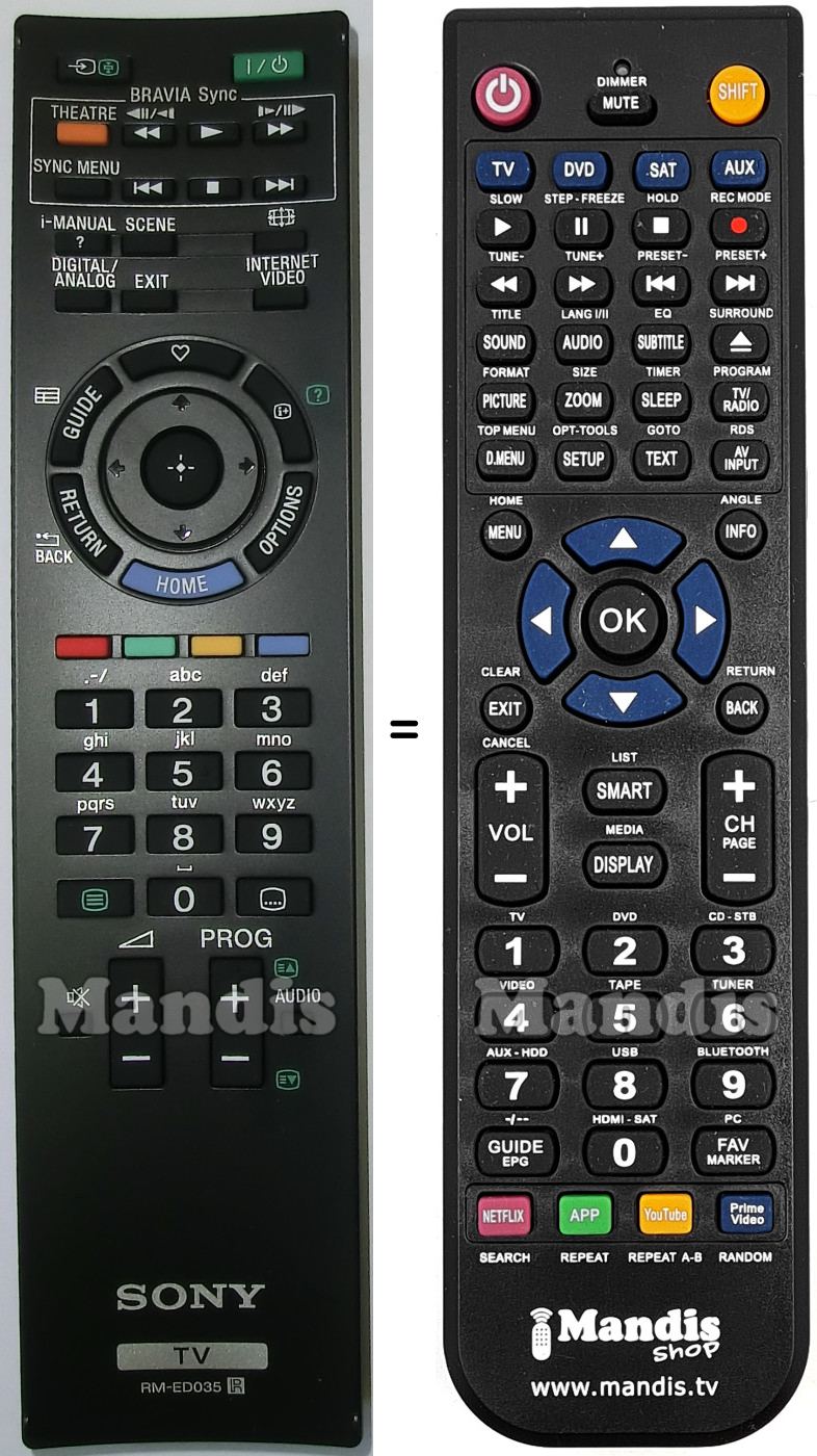 This remote control fully replaces your RM-ED035 (148770012) and offers all the functions of the original.