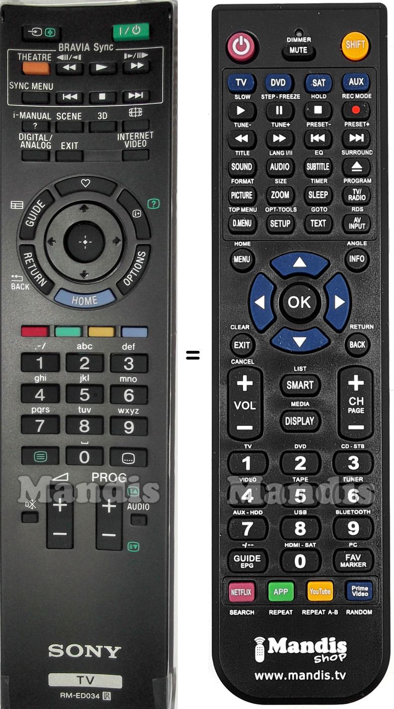 This remote control fully replaces your RM-ED034 (148791411) and offers all the functions of the original.