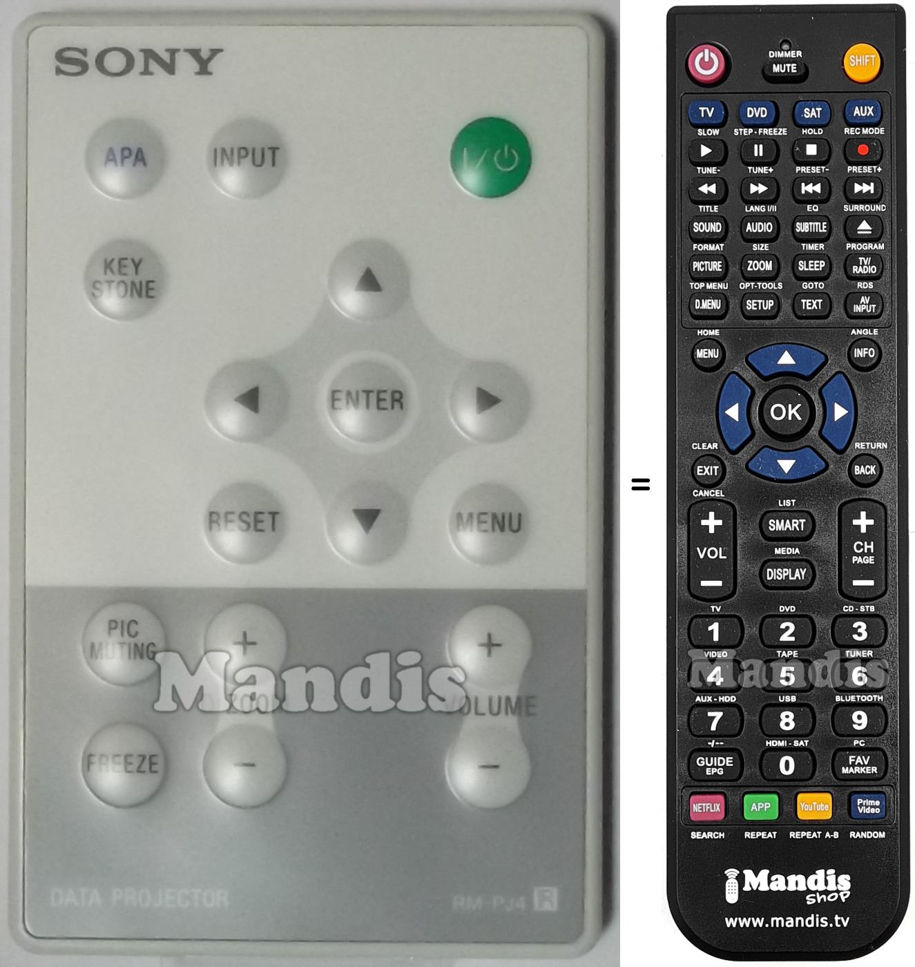 Below, we will show you the correspondence between each button on the original remote control and the button that performs the same function on the replacement remote control. In some cases, you may need to press the SHIFT key before pressing another button to perform certain actions. These additional functions are often not widely used and are included to facilitate understanding of the replacement remote control, or because the original remote control has more buttons than its equivalent.