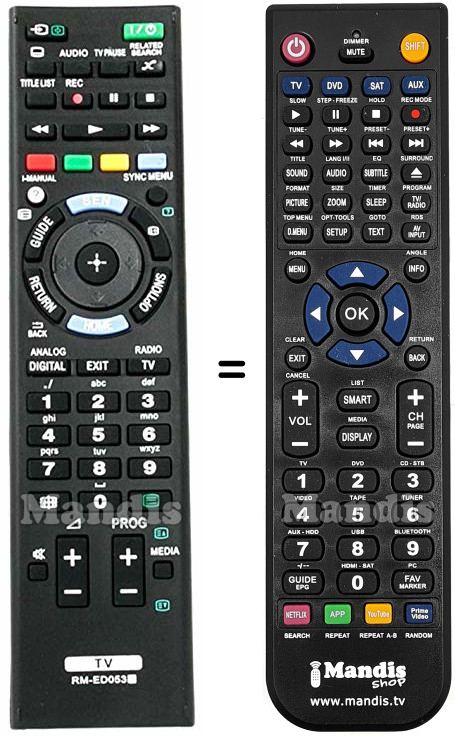 This remote control fully replaces your RM-ED053 (149199511) and offers all the functions of the original.